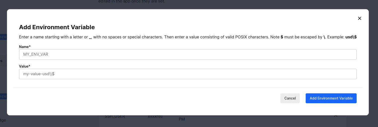 To add an environment variable, click on the Add Environment Variable button and enter the name and value of the variable.