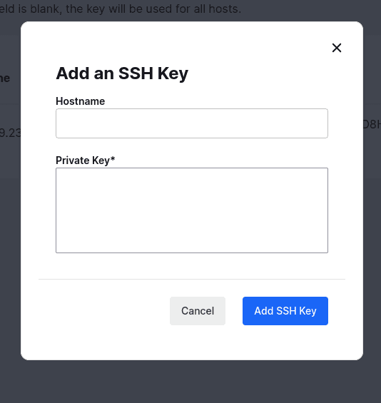 To add an SSH key, click on the Add SSH Key button and enter the name and value of the key.