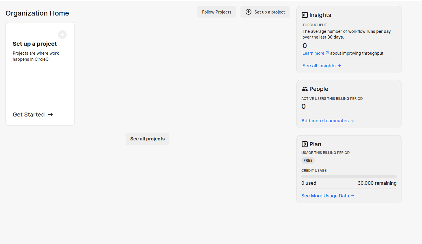 After logging in, you will be redirected to the CircleCI dashboard. There, you will need to create an 'Organization,' and once that's done, you can proceed to create a project. Follow the steps below to complete the process: