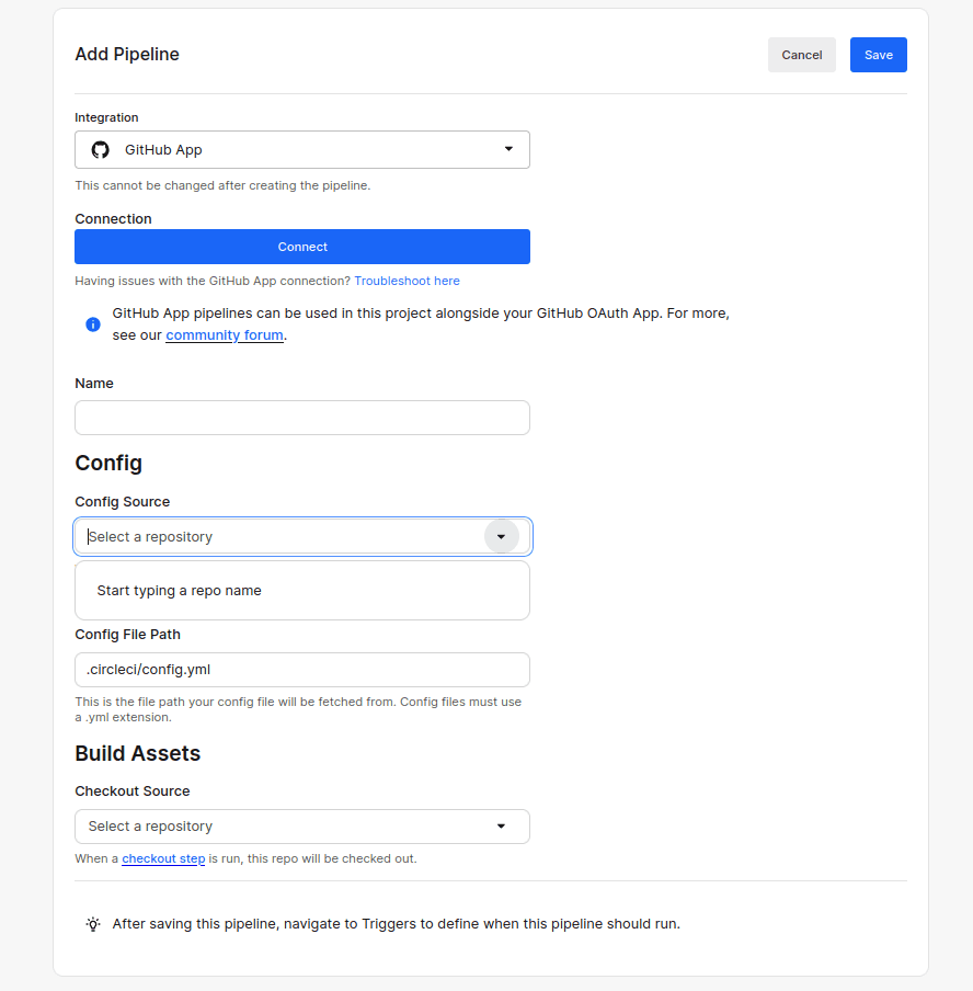Here you can select many types of triggers, but for this tutorial we will select the Github App to create a trigger that will be executed when a pull request is created in to the main branch.